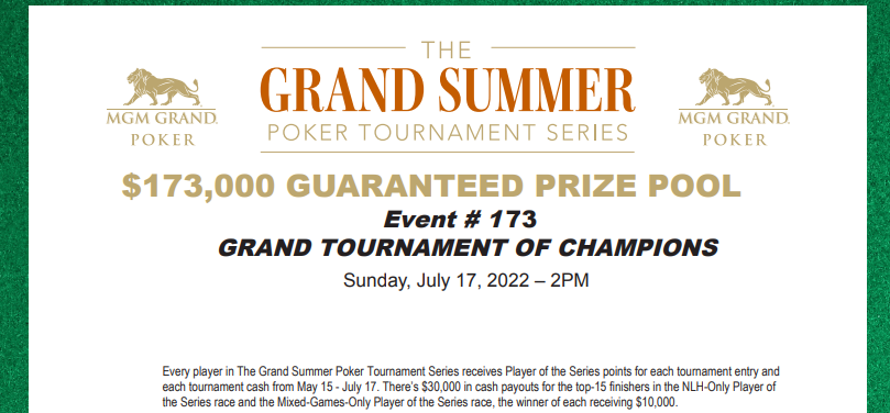На протяжении двух месяцев в Лас-Вегасе проходила серия MGM Grand Summer, главной фишкой которой стал фриролл для всех победителей с призовым фондом $173K. Турнир начинался сразу с ITM. Ради этого события некоторые игроки даже специально летели с другой части света.