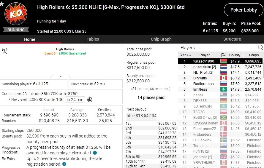 В турнире, который проходил в два игровых дня, было 125 входов. Каждый игрок мог сделать 2 ре-энтри в первые 5 часов 5 минут игры. Призовой фонд составил $625K — сумма делилась пополам на баунти и основной приз. ITM начинался с 14 места и покрывал 1 бай-ин. Каждый участник начинал турнир с 250,000 фишками (104ББ) и $1,250 баунти. Это шестой турнир серии High Rollers, которая проходит на PokerStars с 23 по 30 марта.