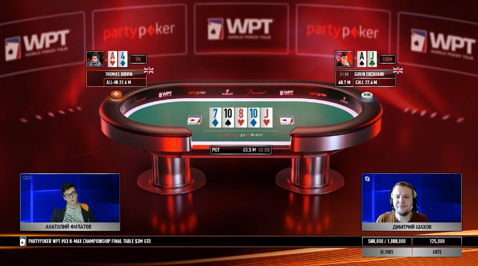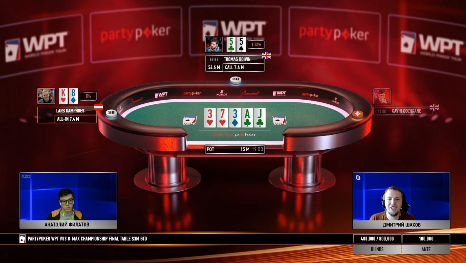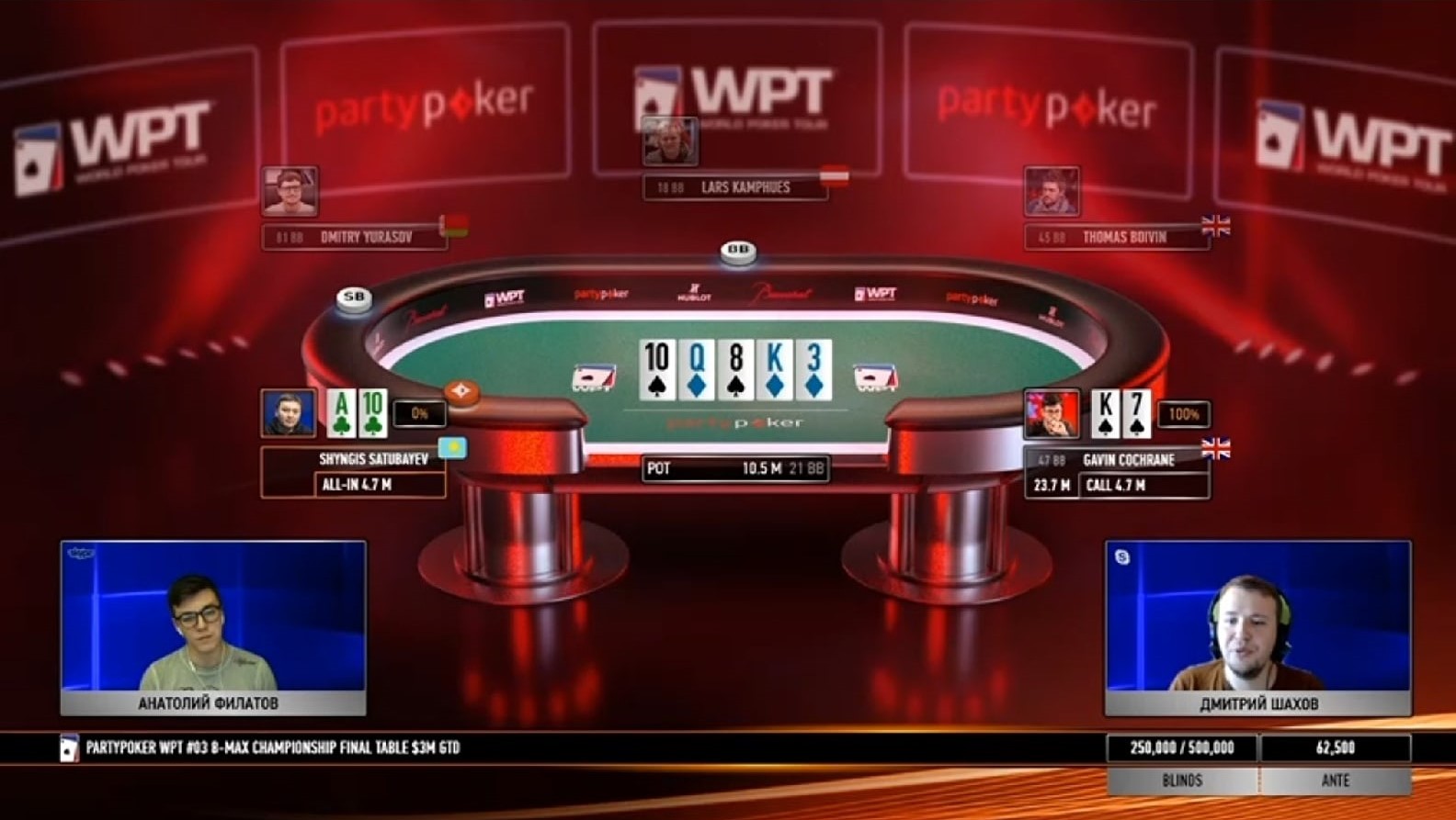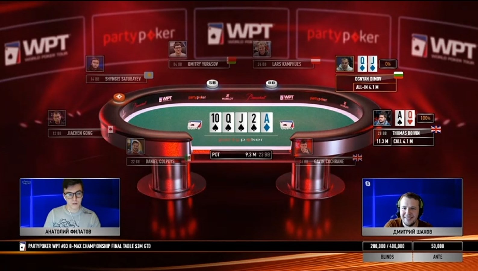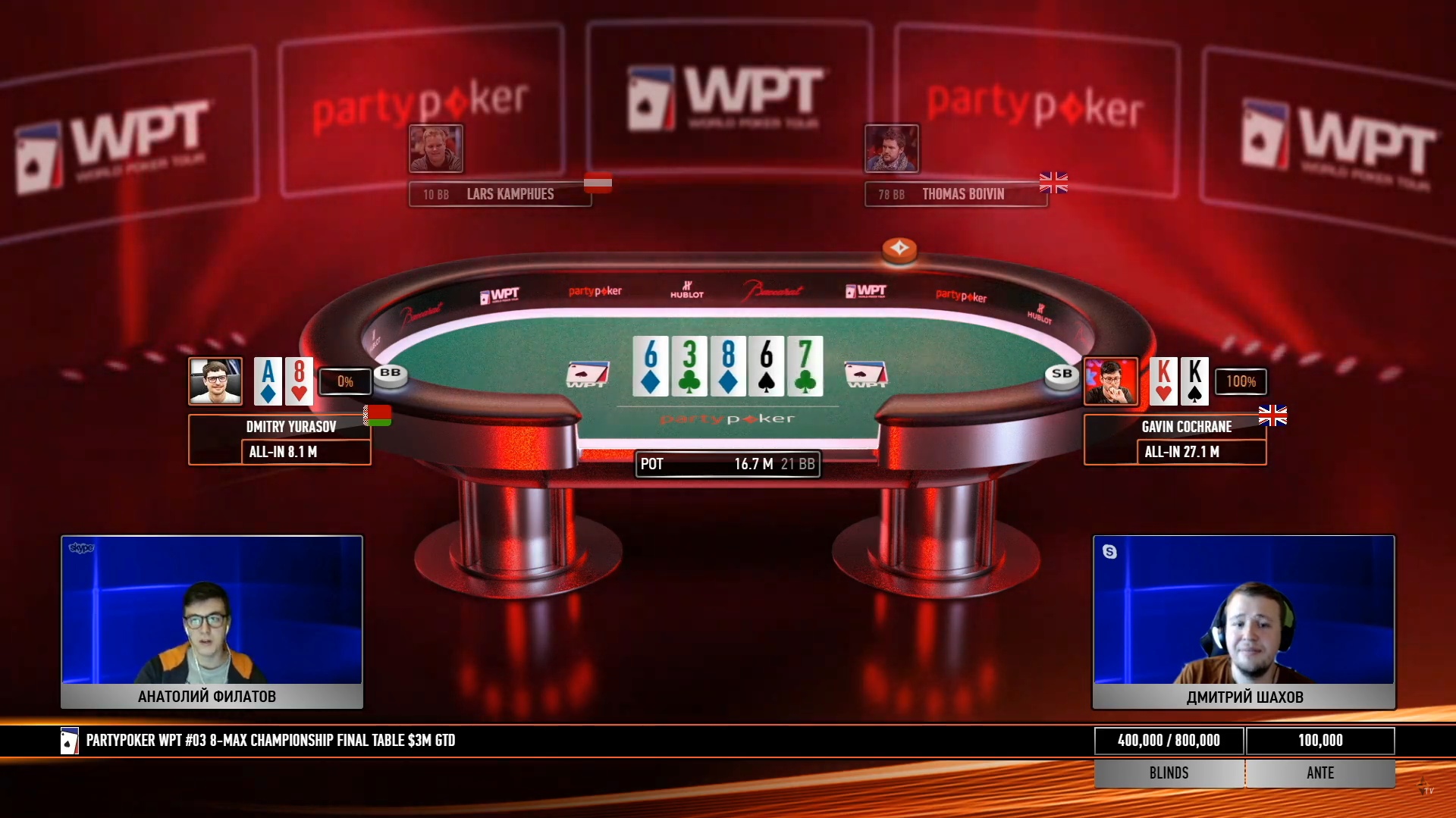 Своеобразную игру показывал Гэвин Кокрейн: первый час финалки он сбрасывал каждую руку, в том числе карманные девятки и дамы — Филатов и Шахов потроллили такой «стиль», предположив, что Гэвин выбрал специальную тактику для пересиживания коротких оппонентов. Но он вовремя вернулся в активное состояние, начал выигрывать коинфлипы и в итоге дошел до хэдз-апа с соотечественником Томасом Бойвином. Примерно полчаса британские джентльмены боролись за победу, но в итоге Томас со стеком 22ББ уступил чемпионский титул Гэвину с 79ББ.