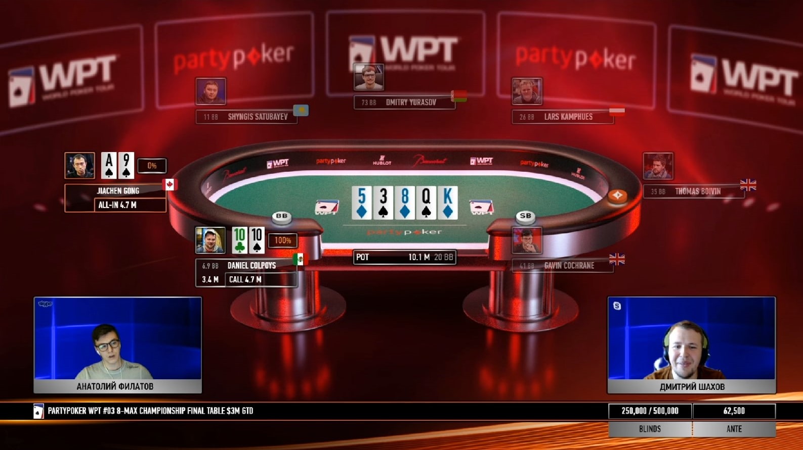 Следующим из ивента вышел Джиачен Гонг. Как и в случае с Дымовым, Гонг выставился в олл-ин на префлопе, но удача оказалась не на его стороне.
