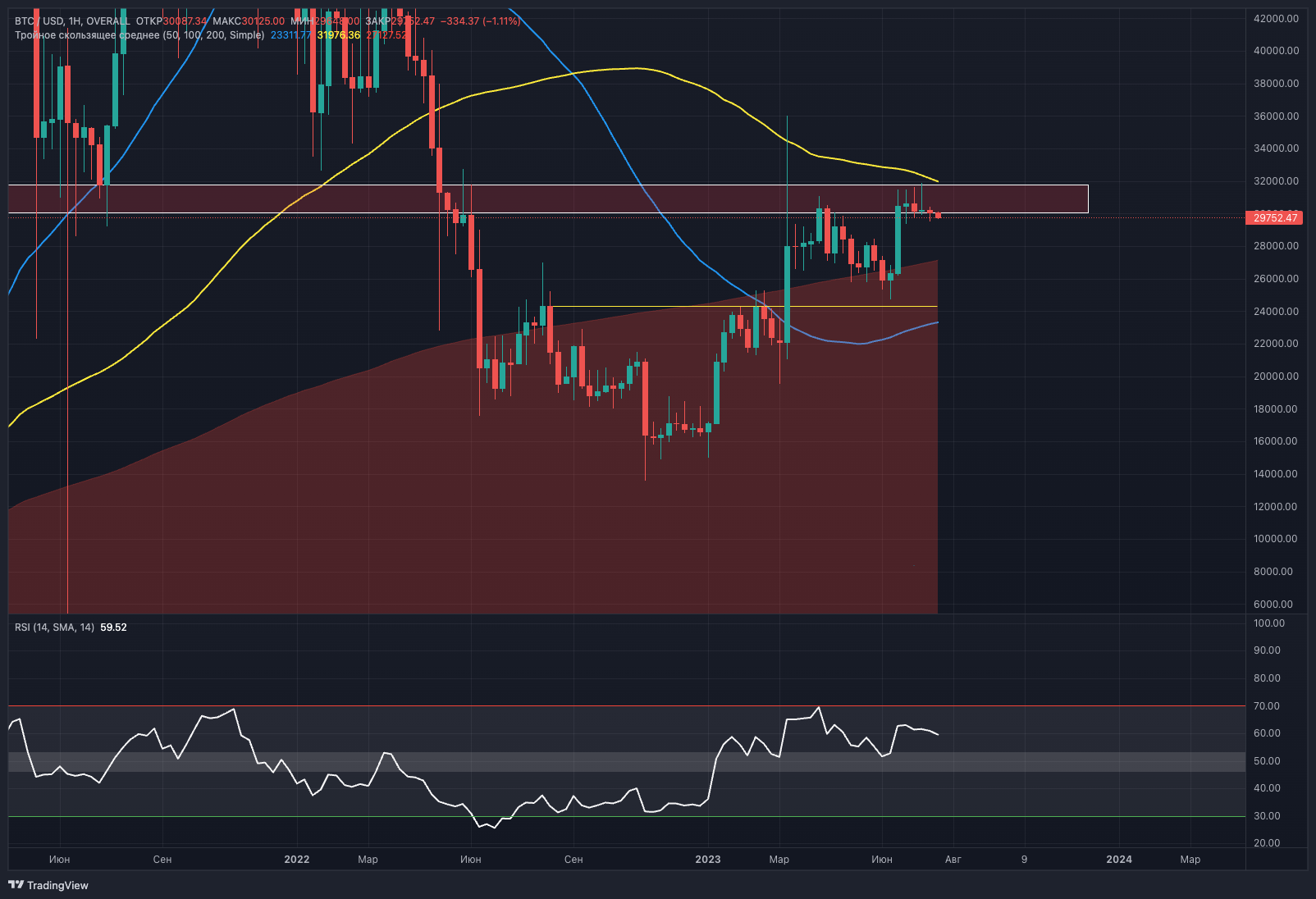 Биткоин завершил очередную неделю, оставшись под уровнем сопротивления в $30,000, показав отрицательную дельту на сумму минус $400 миллионов.