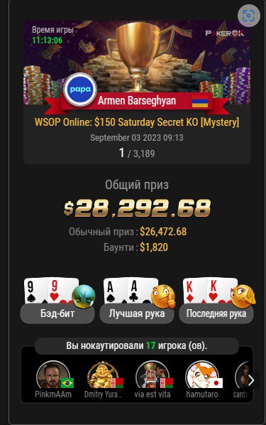 Также пообщались с игроком фонда Арменом Барсегяном, которому за полтора года удалось подняться с ABI$3 до ABI$30 и оформить свой бест-кеш и бест-кеш фонда в $150 WSOP Online Saturday Secret KO ($28,3K).