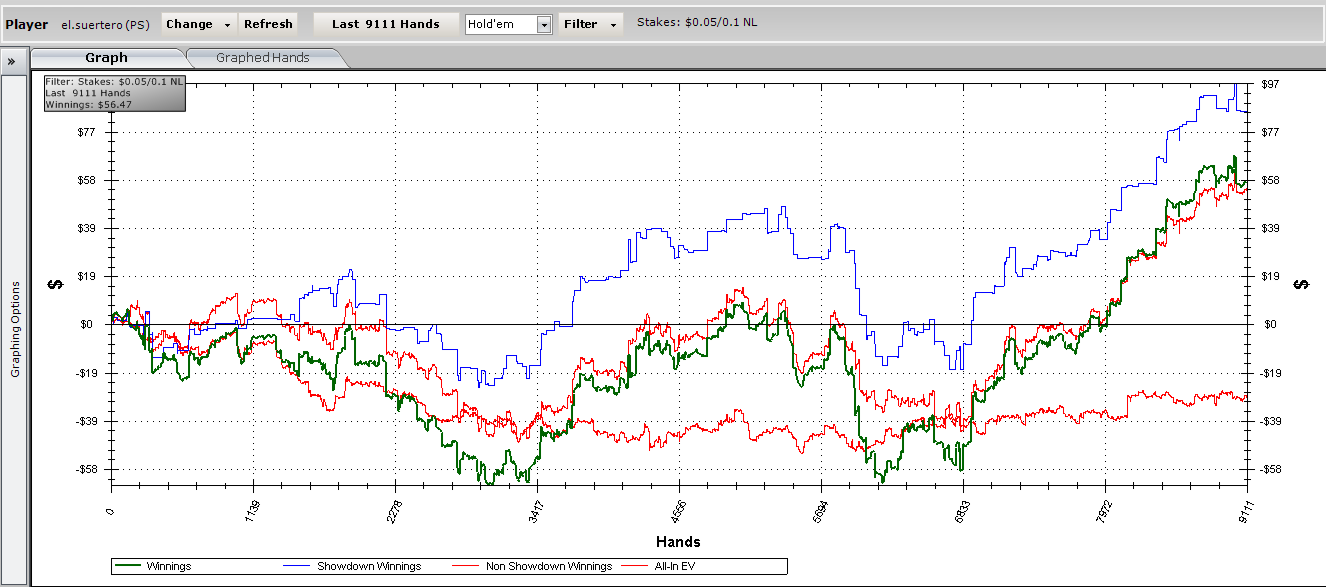 Игралось долго, игралось нудно, но терпение и труд, как говорится, всё перетрут - и диспу, и доезжающих ривером фишей, так что будьте терпеливы - и да воздастся вам. Ну а вообще, мне под конец начало просто нереально заходить, так что я лишний раз порадовался за все те фолды (надеюсь, правильные), которые сделал, пока тёмно-зелёная линия была ниже нуля.