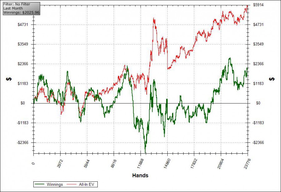 Как обычно я нашел свой лик и начал играть чуть иначе, перестав лупить (как я обычно любил, еще с детства) 3 бареля в любой борд с мыслью "ну на ривере должен же выкинуть, раз флоп не порейзил" и стал действовать чуть умнее.