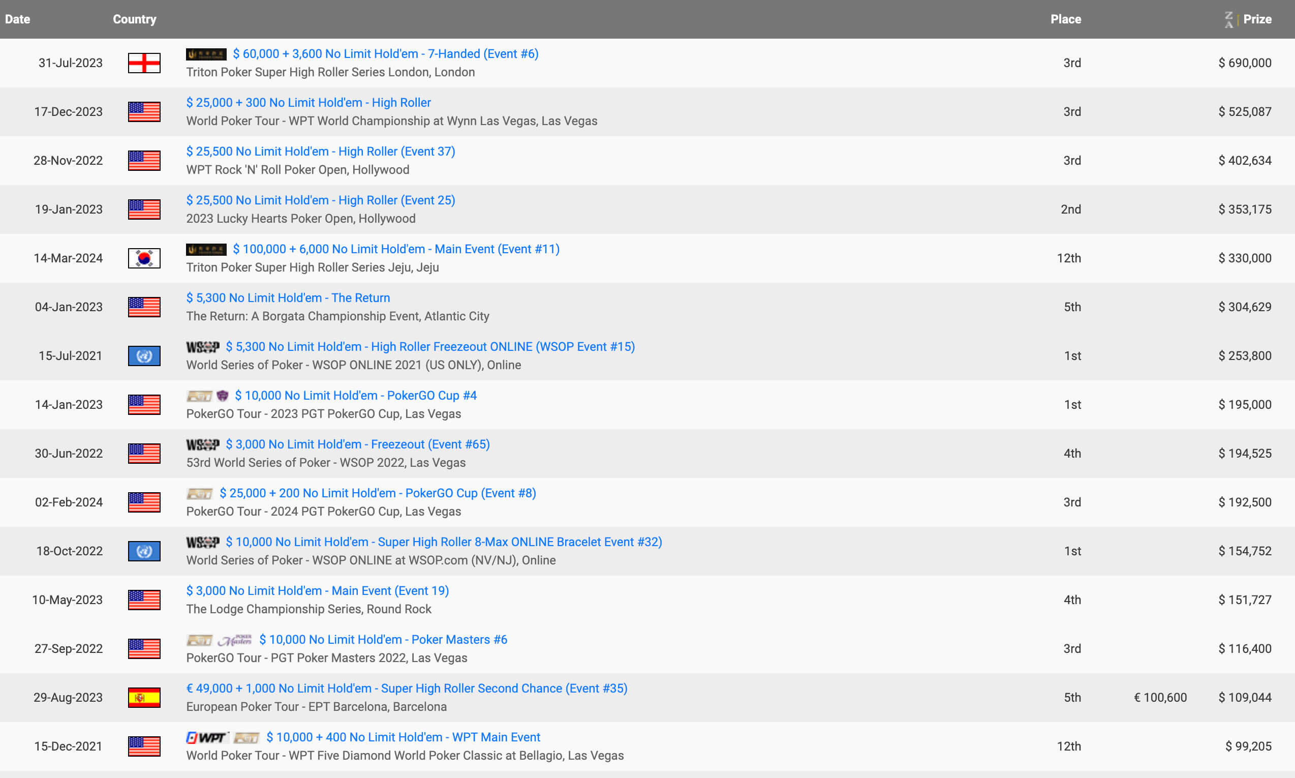 - 2021 год — $5K NLHE High Roller Freezeout ($253,8K)