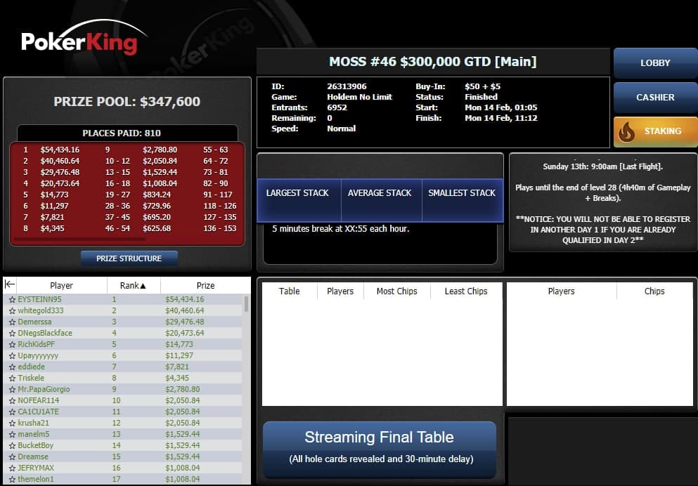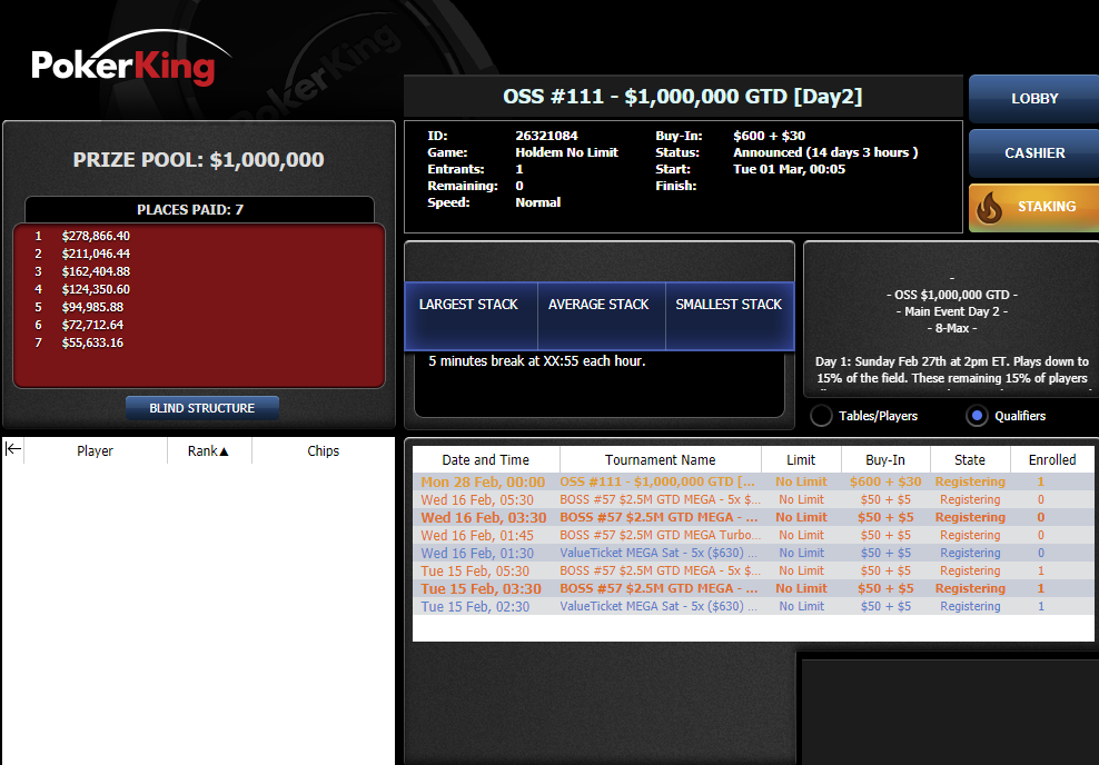 14 февраля стартует вторая часть OSS — расписание уже можно найти в лобби PokerKing. Найти турнир по банкроллу сможет практически кто угодно, так как бай-ины составят от $11 до $630. Вот как выглядит расписание первого дня (время МСК):