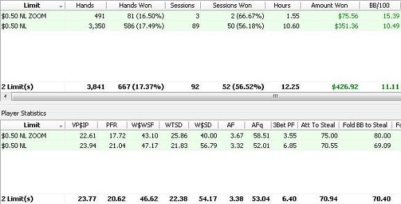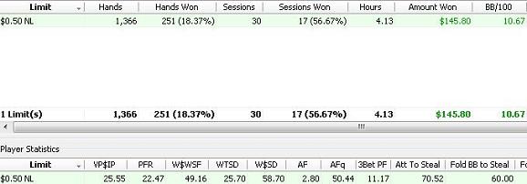 Общие результаты на NL50 (FR): На мой взгляд, в рамках данного поста целесообразно поделиться с вами своими общими результатами игры на NL50 фулл-ринга. Помимо самого HUD своей программы Time Mojo, я руководствовался лишь показателями VPIP и PFR у оппонентов при принятии решений.