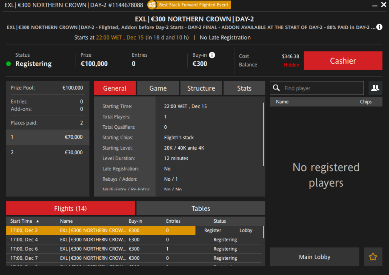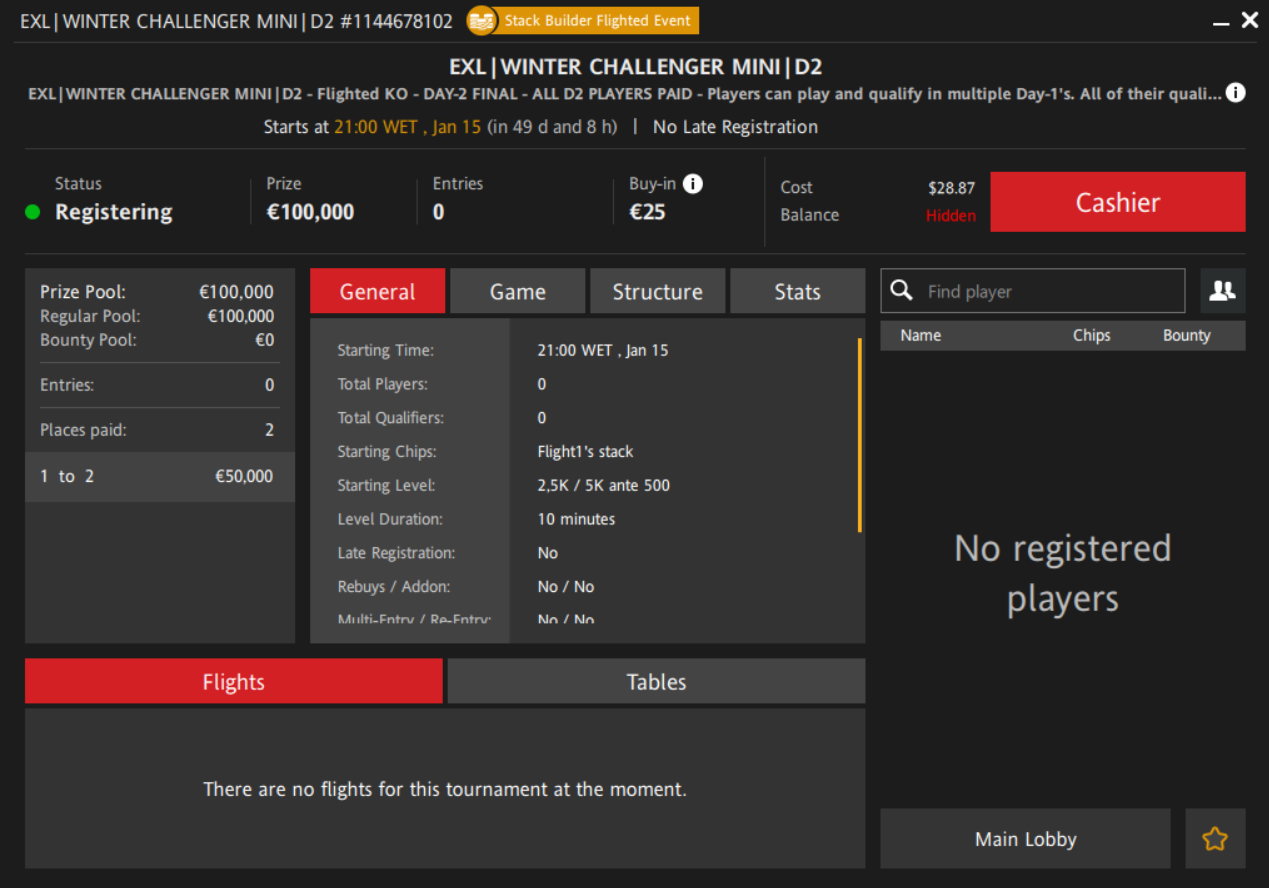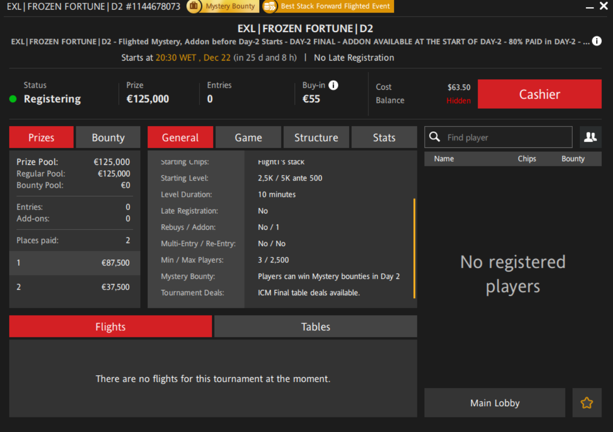 - Frost to Fortune. Цель — набить 2К очков (€200 рейка) в любых MTT. Награда — 10x EXL €0.50 Free Blinds. Длительность: с 1 декабря 2025 по 15 января 2026, каждый игрок может получить за это время до 6 наград.