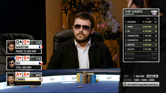 , он открылся 450,000 с хайджека, катофф колл, Зинно 3-бет с ББ, Мартини ответил пушем на весь стек 5,870,000. Зинно снэп-коллит, показывает A