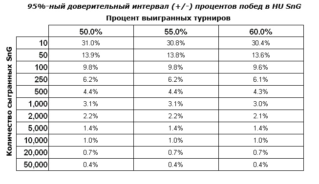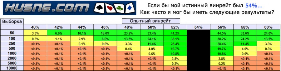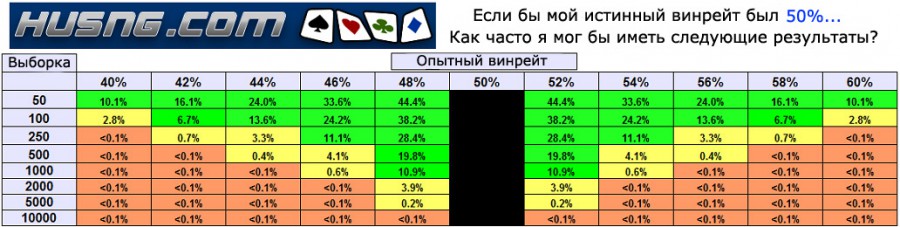 Как читать таблицы: Давайте представим, что Ваш процент побед — 56, за более чем 250 турниров, однако Вы беспокоитесь о том, что Вам, возможно, просто везёт, а реальный Ваш винрейт составляет около 50%. И Вам хочется знать, как часто, в теории, Вы будете выигрывать 56% из первых 250 игр, если в будущем в действительности Ваш винрейт составит лишь 50%. Отправляемся в таблицу с заголовком “50%” — это тот винрейт, который, как Вы предполагаете, должен у Вас быть, затем ищем строку “250” и колонку “56%”. Таблица говорит Вам о том, что такой результат (или даже более 56% победных игр) будет случаться с игроком, который на дистанции выигрывает всего 50% турниров, всего лишь в 3.3% случаев. Таким образом, да, такой результат возможен, однако является маловероятным событием.