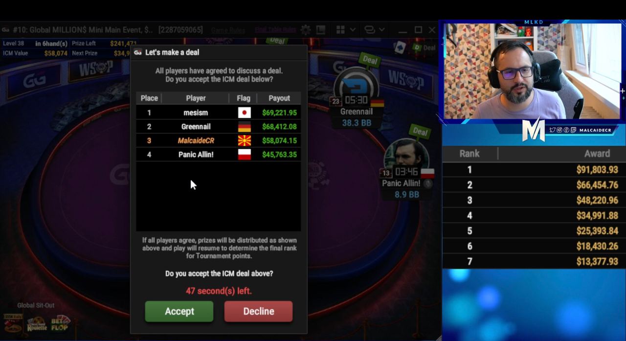 17 июля испанец из Болгарии Мартин «MalcaideCR» Алкайде на стриме согласился дележку в $50 WSOPC Global MILLION, где было 27,149 входов. В 4-max оппоненты договорились на следующие суммы: