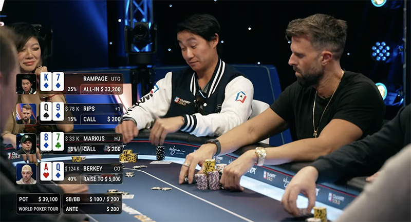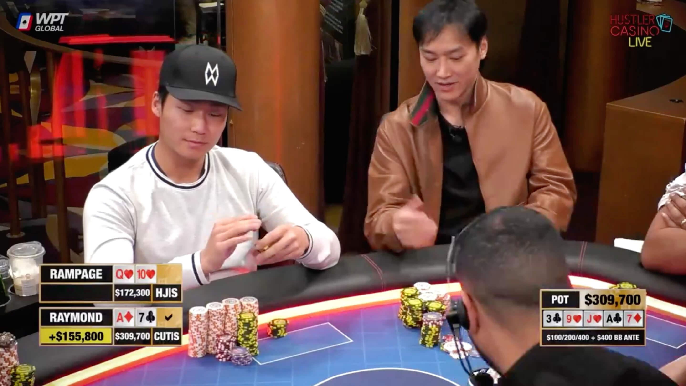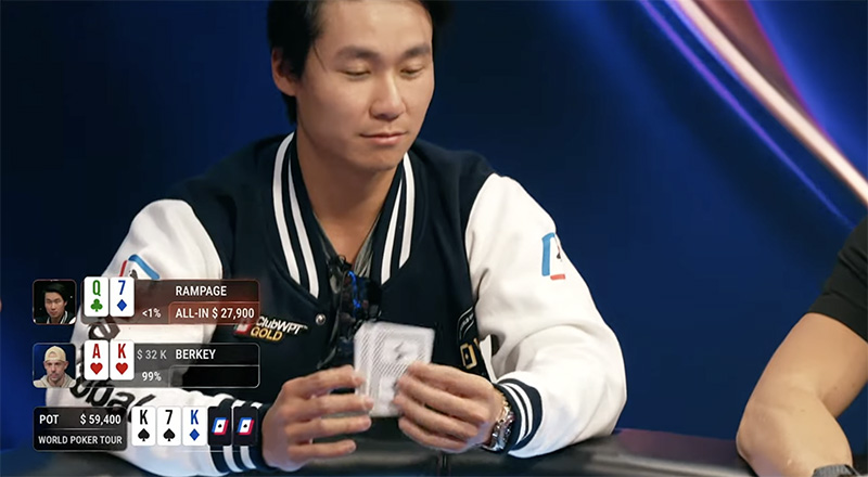 Примечание Покерофф: запись игры доступна на YouTube. Rampage отыграл в первой сессии около часа. Две крупные раздачи он проиграл Мэтту Берки.