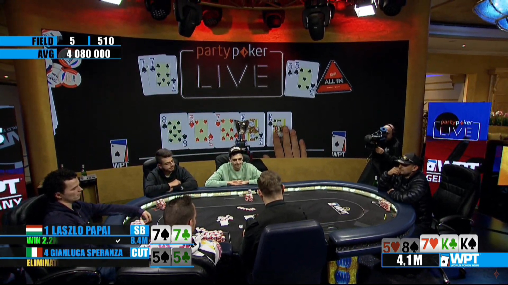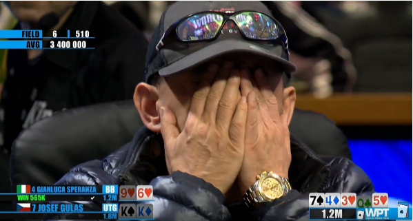 Правда, Джанлуке эта победа не слишком помогла — короткое время спустя он вынужден был пойти ол-ин с 55 против 77 будущего вице-чемпиона этого ивента Лазло Папаи. Флоп дал по сету обоим, а вышедшие на терне и ривере короли закрыли фулл-хаусы, завершив участие в ивенте Сперанзы с выигрышем в €68,000.