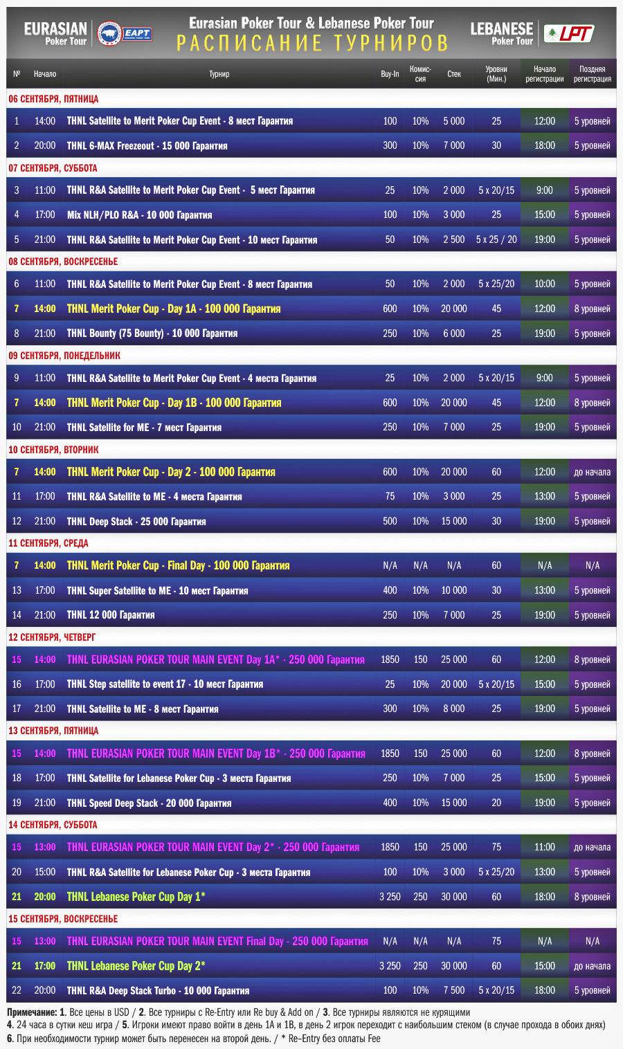 В серии представлены турниры с различными бай инами, и множеством сателлитов на Мейн,и на более дорогой турнир, который называется Lebanese Poker Сup. Данный турнир сделан с более дорогой входной платой и будет интересен, не только местным участникам, но и ливанцам, туркам и другим бизнесменам из различных стран, которые любят приезжать играть в покер именно на выходные.