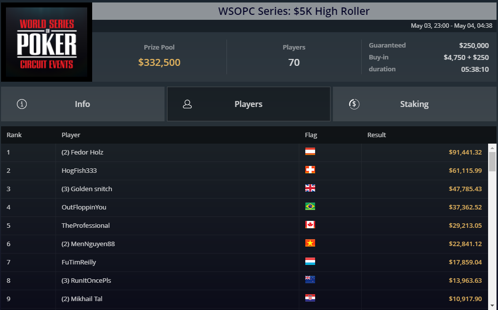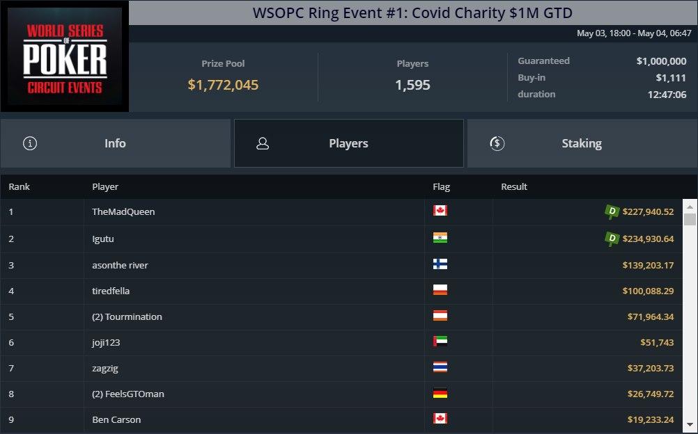 По итогу турнира в топ-2 была заключена сделка: Igutu занял второе место и получил $234,930, а за первое TheMadQueen забрал чуть меньше ($227,940), но зато с перстнем чемпиона WSOPC Online.