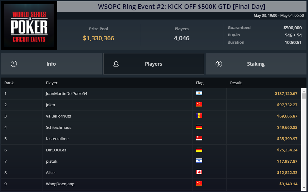Всего в первом «перстневом» турнире набралось 1595 входов, благодаря чему гарантию $1M перебили на солидную сумму, даже несмотря на то, что в вечер воскресенья у GGNetwork были привычные проблемы с серверами. К счастью, техники быстро всё починили и турнир не пришлось отменять.