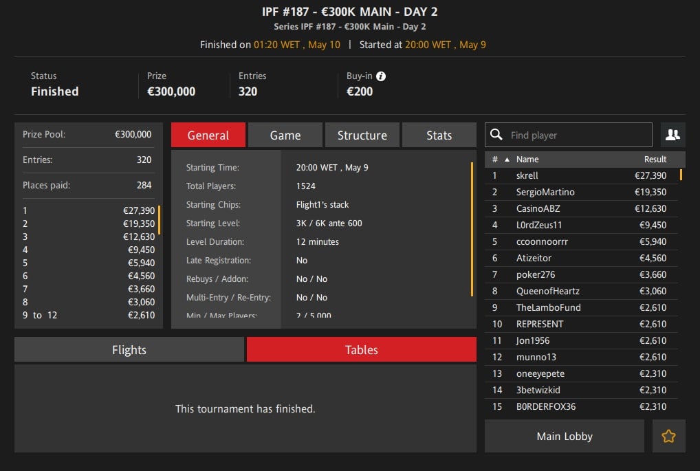 Входные флайты €200 IPF Main Event ежедневно проходили с 29 апреля, и этого не хватило для побития гарантии €300K. Было собрано 1524 входа — оверлей составил около €23K, но с учётом рейка рум остался в небольшом плюсе.