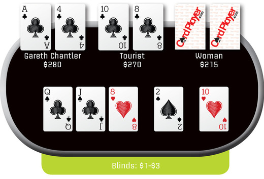 Гарет Чентлер: Я бы сказал, что мой имидж был довольно тайтово-агрессивным. Я не разыгрывал кучу рук, так что у моих оппонентов вряд ли имелся какой-либо повод считать, что я перегибаю палку, к тому же большинство моих стартовых рук были достаточно сильны. Судя по предыдущим раздачам, женщина была тайтово-пассивной, а турист – маньяком, который пытается влезть в каждую раздачу.