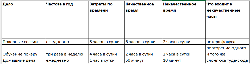 Вам нужно вспомнить все свои обычные дела и оценить степень их энергозатратности. Это касается не только покера, но и общения с другими людьми, которые способны как обмениваться с нами энергией и бодрить, так и высасывать из нас всё без остатка. Составьте списки своих дел по энергозатратности либо добавьте необходимые столбцы в таблицу времени — последнее может быть для вас более удобно при переходе к следующему шагу.