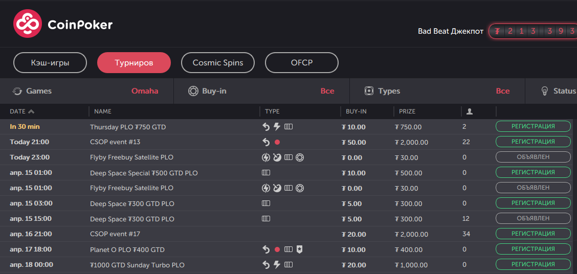По 17 апреля на CoinPoker проходит серия CSOP. В расписании два турнира по PLO:
