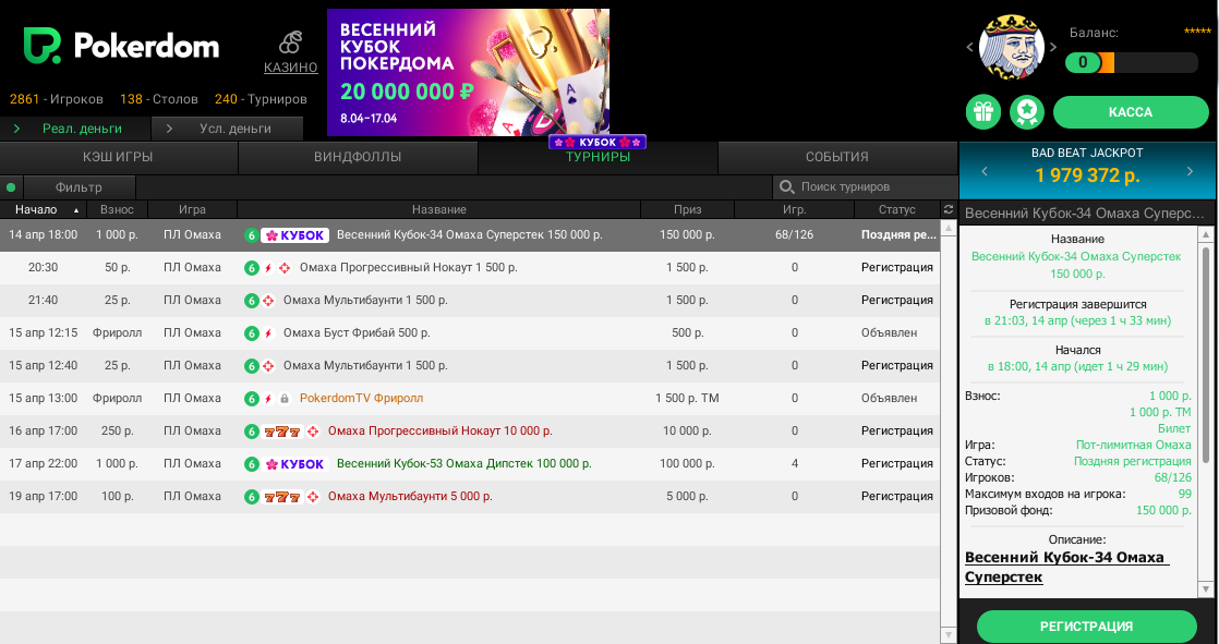 - сегодня в 18:00 МСК — ₽1,000 Омаха Суперстек ₽150,000 GTD — поздняя регистрация до 21:00 МСК.