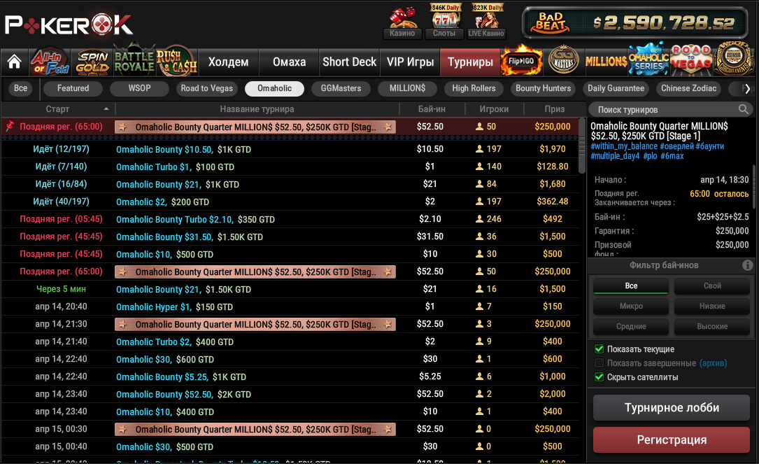 Помимо серийных турниров на ПокерОК каждый день проходит около 60 турниров по Омахе. Загрузка идёт круглосуточно. Бай-ины от $1 до $84.