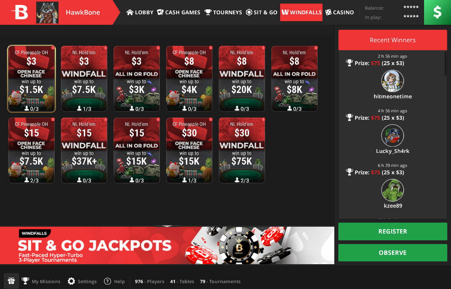 Рейк в классических Windfalls — 8% (с бай-инами $3 и $8) и 7% (с бай-инами $15 и $30).