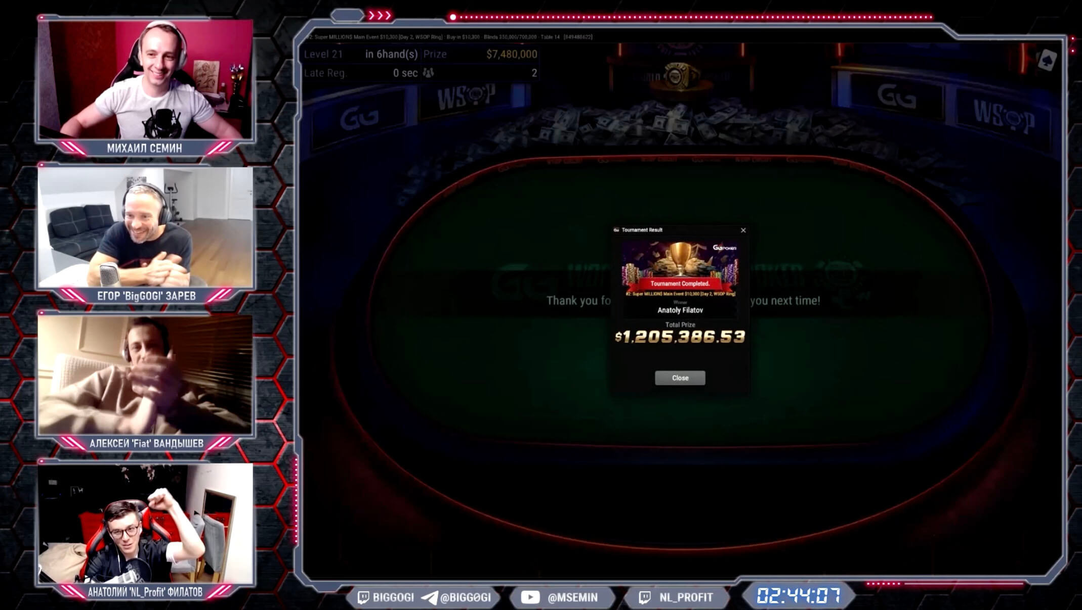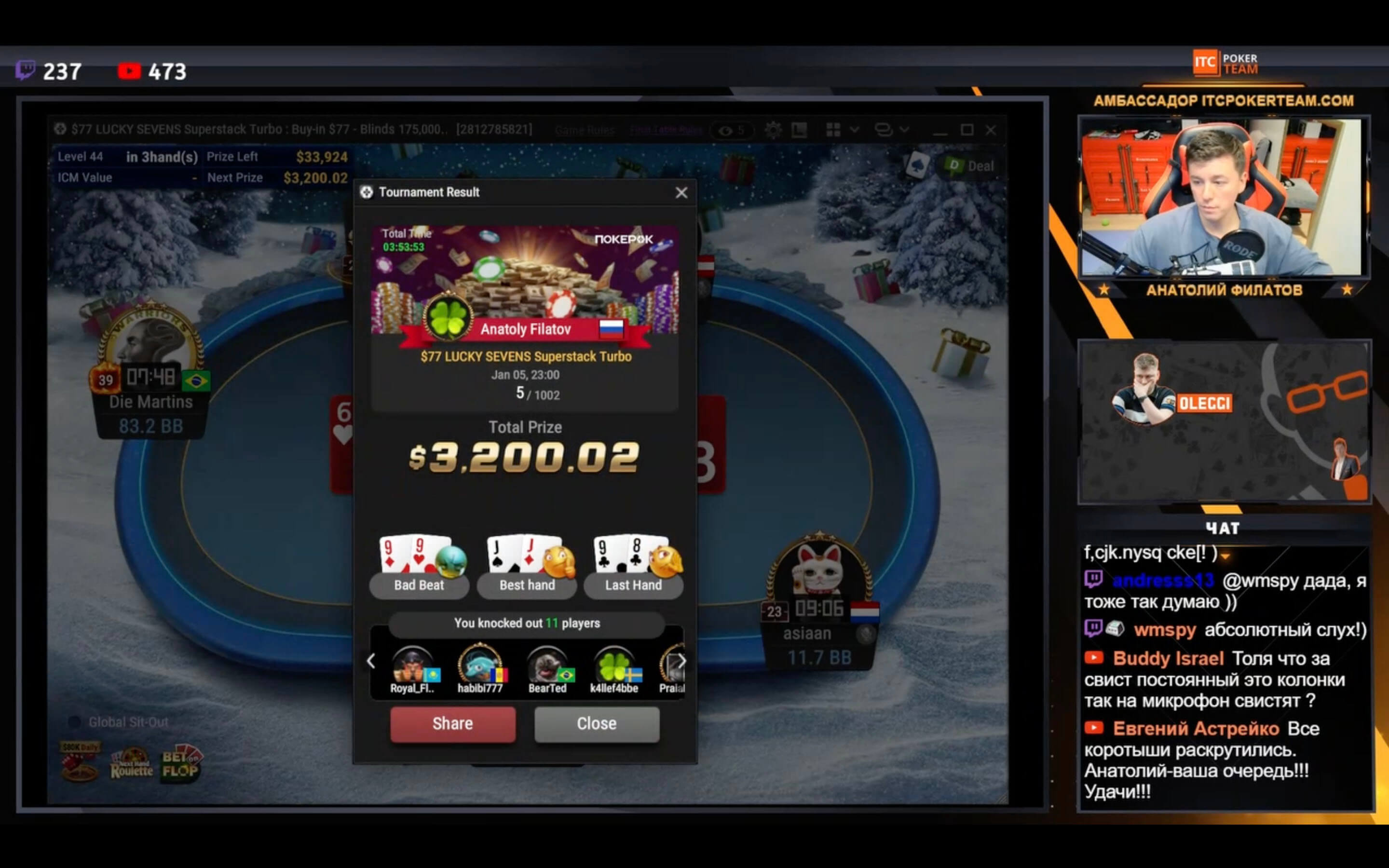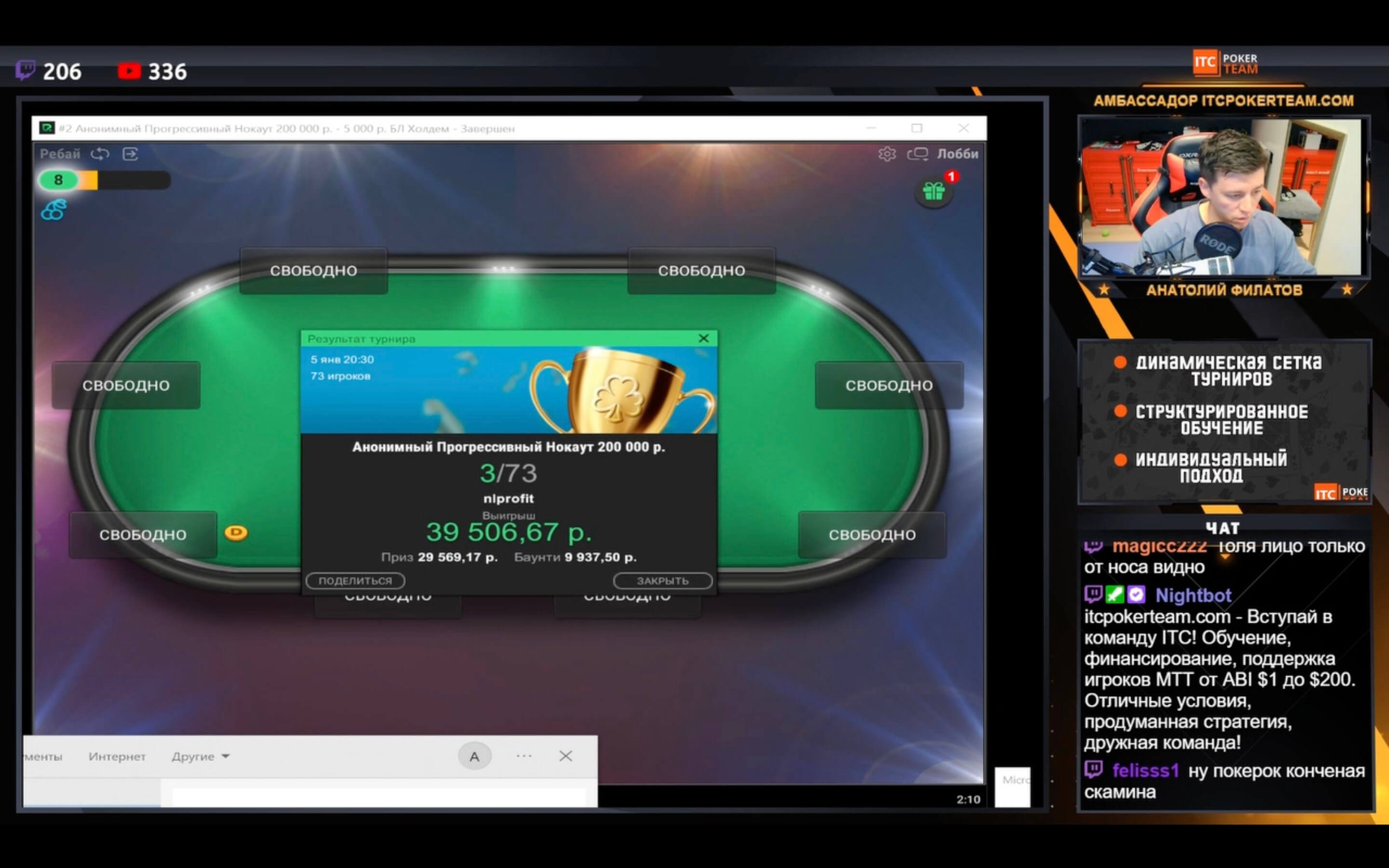 Первый стрим в 2024 году Анатолий Филатов подрубил на канале ITCPokerTeam 5 января. Катал турниры до $250 на ПокерОК, PokerKing и Покердоме. Вышел на две финалки.