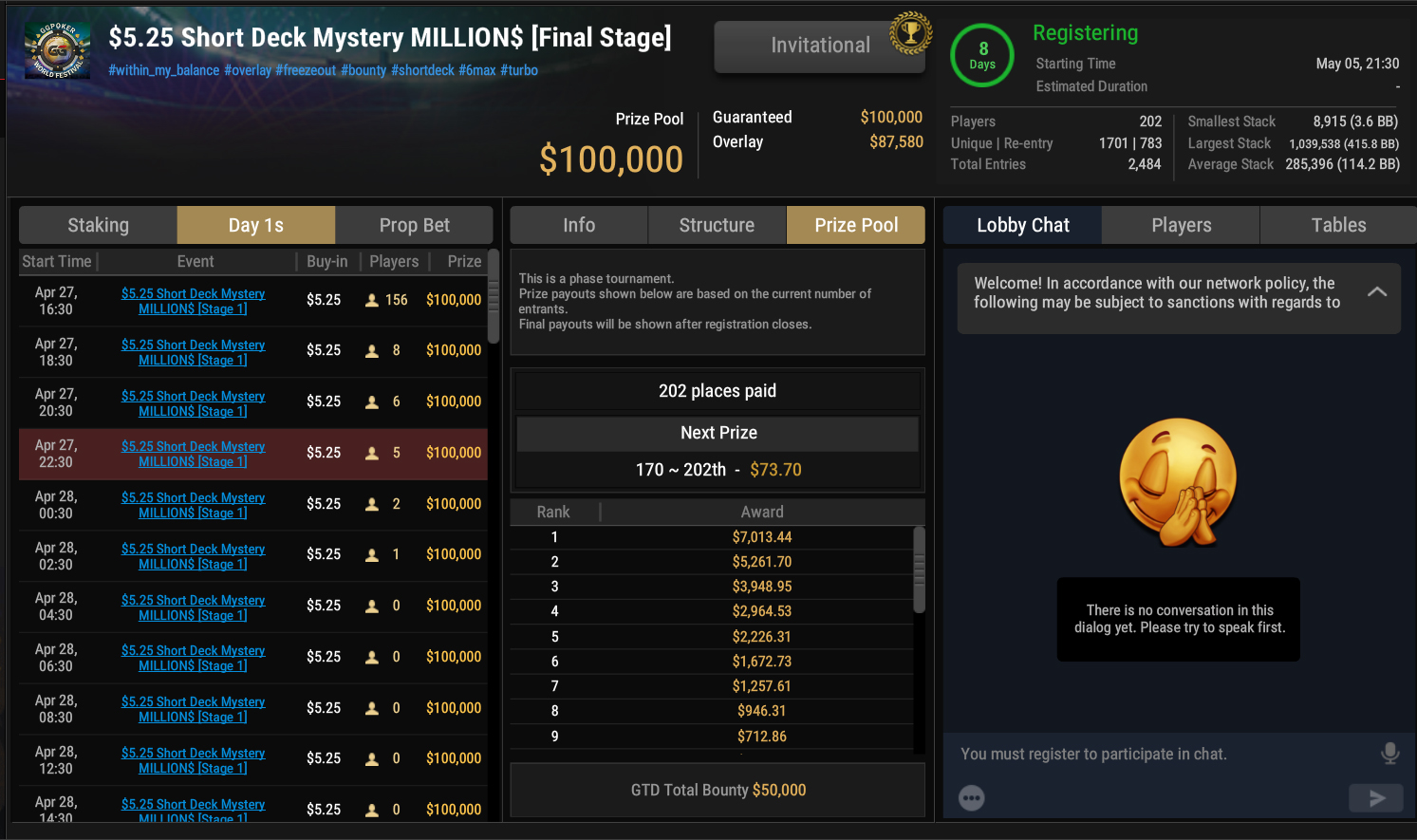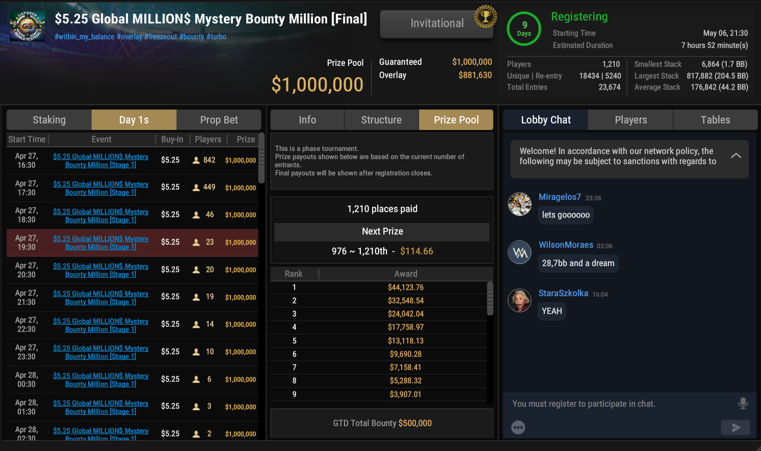 - $525 Global MILLION$ Mystery Bounty $10,000,000 Gtd — Final стартует 20 мая в 21:30 МСК.