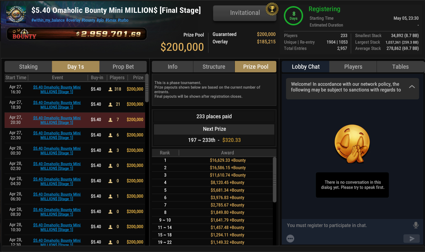 - $50 Global MILLION$ World Festival $2,024,000 Gtd — Day 2 стартует 13 мая в 21:30 МСК.