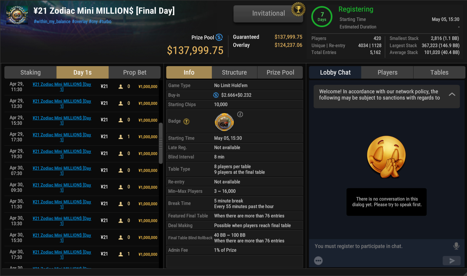 - ¥1,500 Zodiac Asia Championship $1,100,000 Gtd — Final Stage стартует 26 мая в 15:30 МСК.