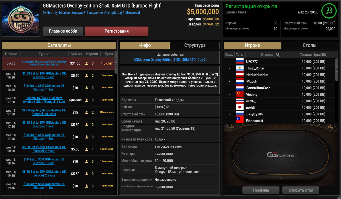 Оба турнира поражают своими гарантиями с шестью – семью нулями. Пока GGMasters Overlay Edition не добавлен в лобби, поэтому для сравнения мы взяли структуру обычного еженедельного турнира GGMasters.