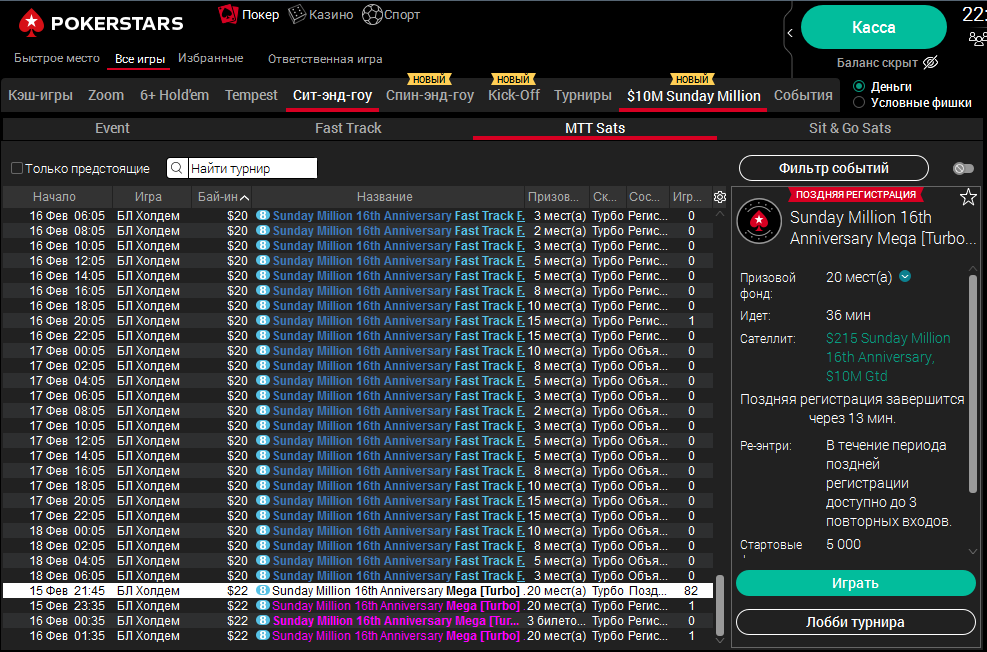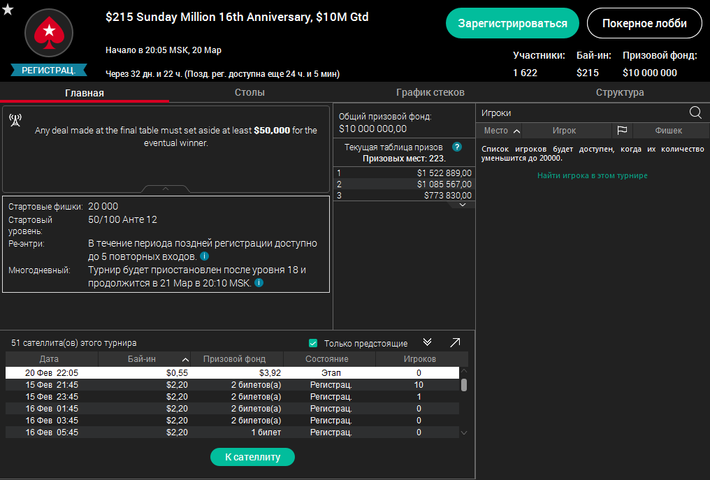 На PokerStars нон-стоп идут отборы в Sunday Million. Вот список самых популярных сателлитов: