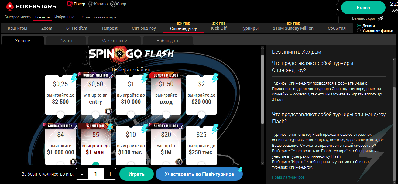 Отобраться на Sunday Million можно через турниры Spin&Go Sunday Million Edition с бай-инами $0,50; $1,50; $4 и $20.