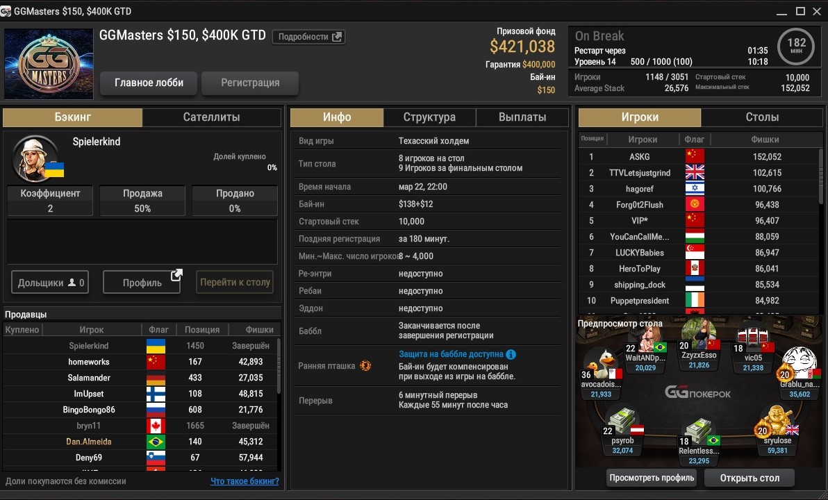 Что касается турнира от 22 марта, то в $150 GGMasters $400K Gtd зарегистрировался 3,051 игрок, благодаря чему итоговый призовой фонд превысил гарантию на $21,038.