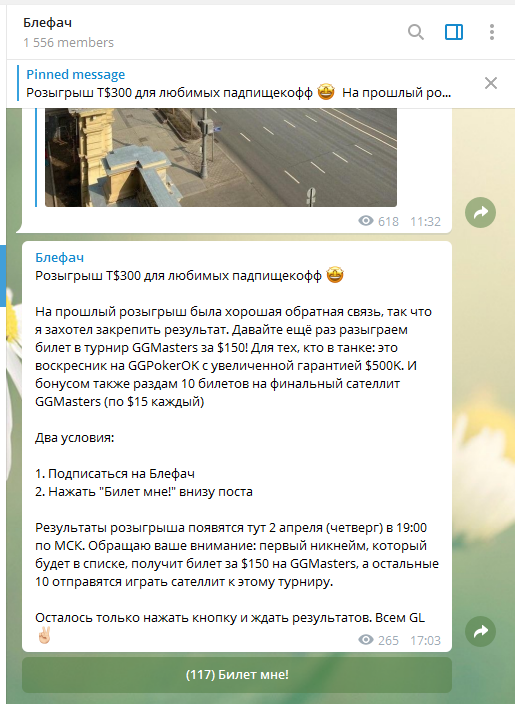 подписывайтесь на канал Блефач, участвуйте в закрепленном конкурсе и получите шанс выиграть один из одиннадцати призов (главный приз T$150 и 10 призов по T$15). Розыгрыш пройдет 2 апреля в 19-00 МСК.