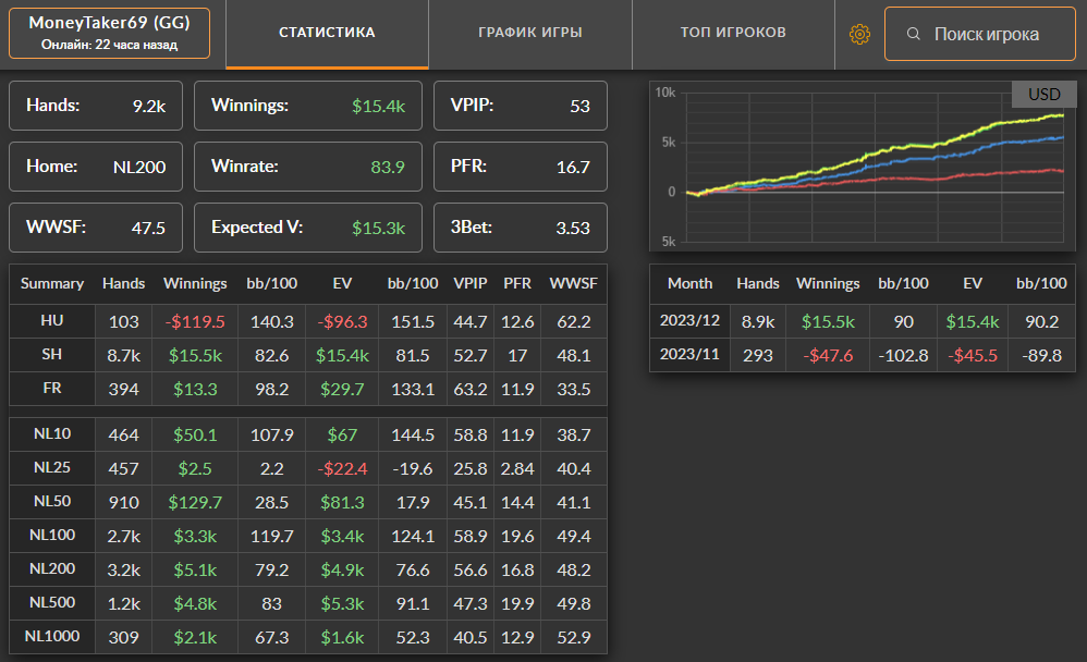 Ещё один интересный момент, появившийся в Твиттере после выстрела темы про MoneyTaker69 — его проверка по SharkScope. Несмотря на то, что с сентября 2023 сайт больше не может трекать румы GGNetwork — кстати, Дэвид Лаппин и Аарон Барон именно этот факт считают источником проблемы с потенциальным риском мошенничества на GG — там сохранились данные об игроках.