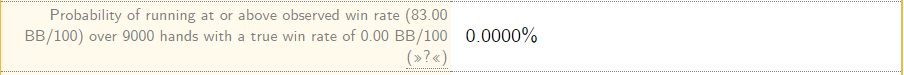 Обычно результат игрока с таким соотношением VPIP/PFR будет около -50 бб/100. Даже если бы он играл около нуля со своими статами, это всё равно выглядело бы как статистическая аномалия. Чтобы вы понимали, насколько это маловероятно — вот так выглядит симуляция вероятности его нахождения около нуля с текущими данными по Primedope: