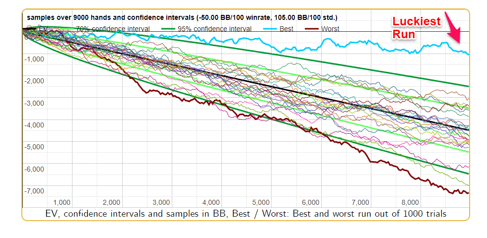 Если продолжить создавать симуляции для этого игрока через калькулятор дисперсии Primedope, то картина будет вполне однозначная — на 9,000 рук лучшим результатом для -50 бб/100 игрока будет -10 бай-инов (голубая линия). MoneyTaker69 выиграл 77 бай-инов.