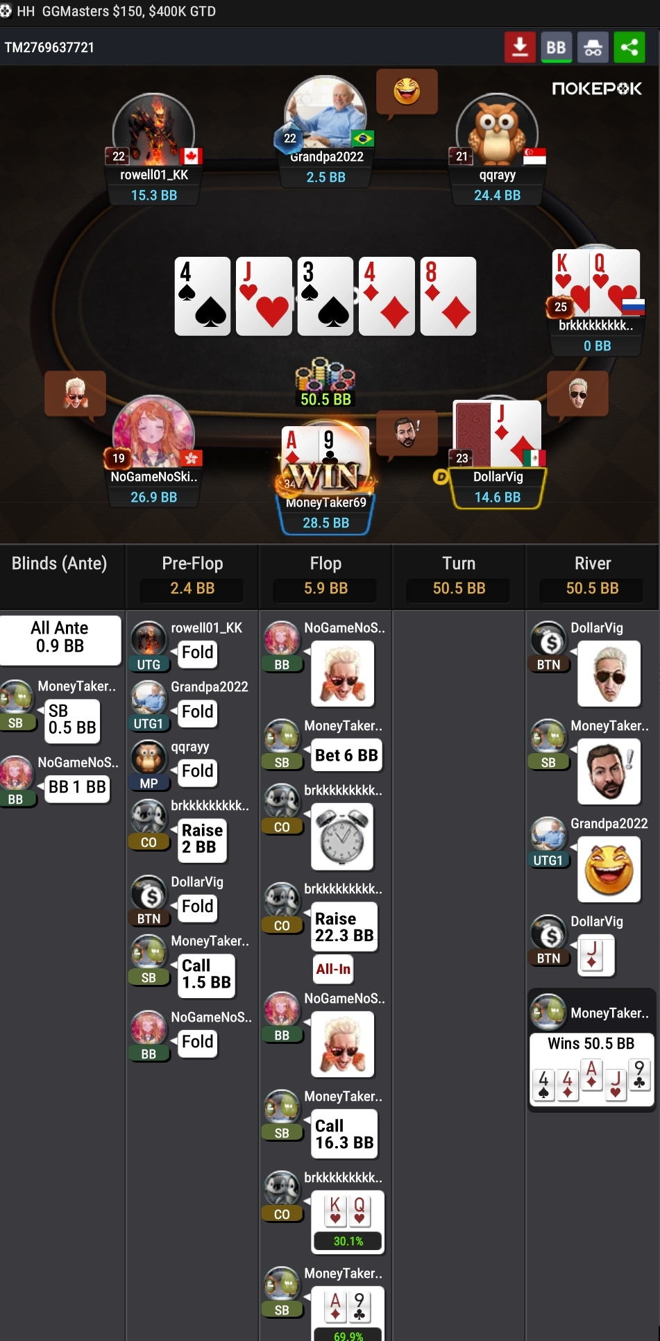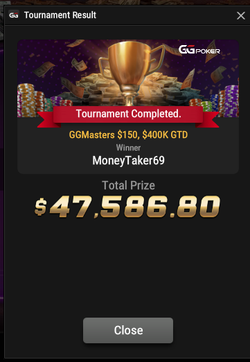 В декабре 2023, Moneytaker выиграл на GGPoker 90 бб/100 за 8,900 рук с VPIP 53%. Через короткое время после этого он затащил $150 GGMasters $400K Gtd с призом $47,586 — при этом он придерживался крайне волатильной стратегии, которая выглядела подозрительно. GGPoker были проинформированы о нём в частном порядке, но я считаю важным для сообщества незамедлительно узнать обо всём в деталях.