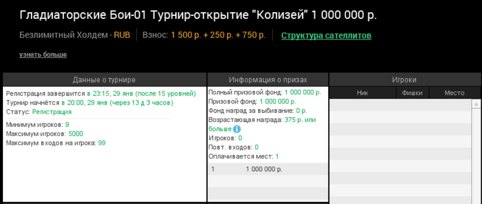 Первым пройдет турнир-открытие «Колизей» с бай-ином ₽2,5К и гарантией ₽1М. Он стартует 29 января в 18:00 МСК, регистрация уже открыта.
