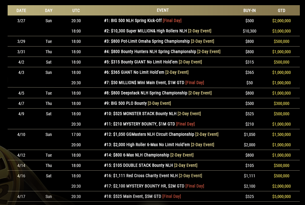 - 16 апреля — двухдневный Главный Турнир Весны. Бай-ин ₽5,000. Гарантия ₽3,000,000.