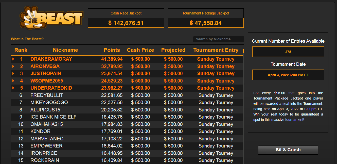 На прошлой неделе в призы попали 1,140 игроков. Минимальный приз $50, максимальный — $500. Вдобавок к основному призу топ-375 игроков получили билеты на турнир $95 Beast & SnC MEGA Sat с гарантией 20 билетов по $2,650 GTD.