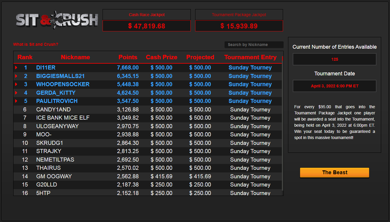 На прошлой неделе в гонке Sit & Crush было разыграно $16K. В призы попал 381 игрок: