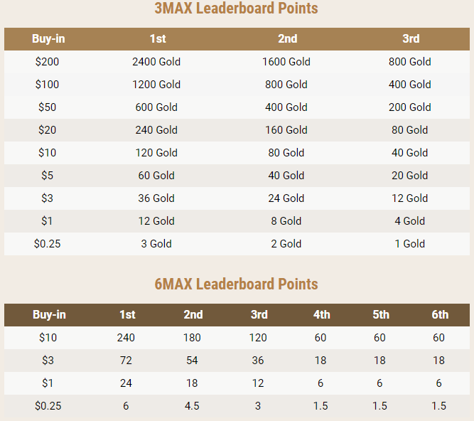 | Spin&Gold | $20K | Очки начисляются в зависимости от занятого в турнире места и размера бай-ина.** |