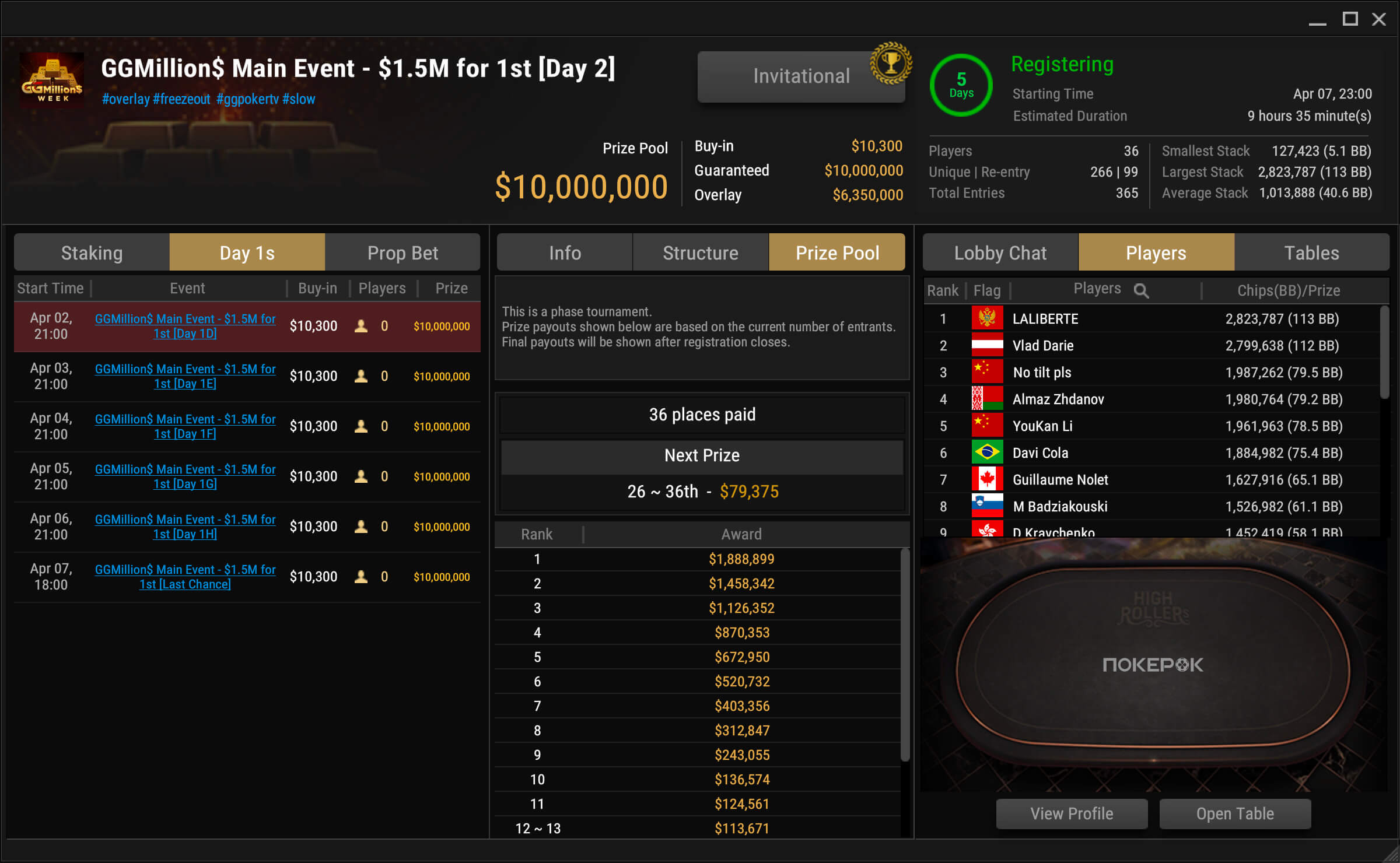 - $108 Mystery Bounty Main Event $5M GTD — турнир в формате стейджей, можно сыграть несколько — стеки суммируются. В турнире будет разыграно 10 Mystery Bounty по $100K. Day 2 пройдёт 21 апреля.