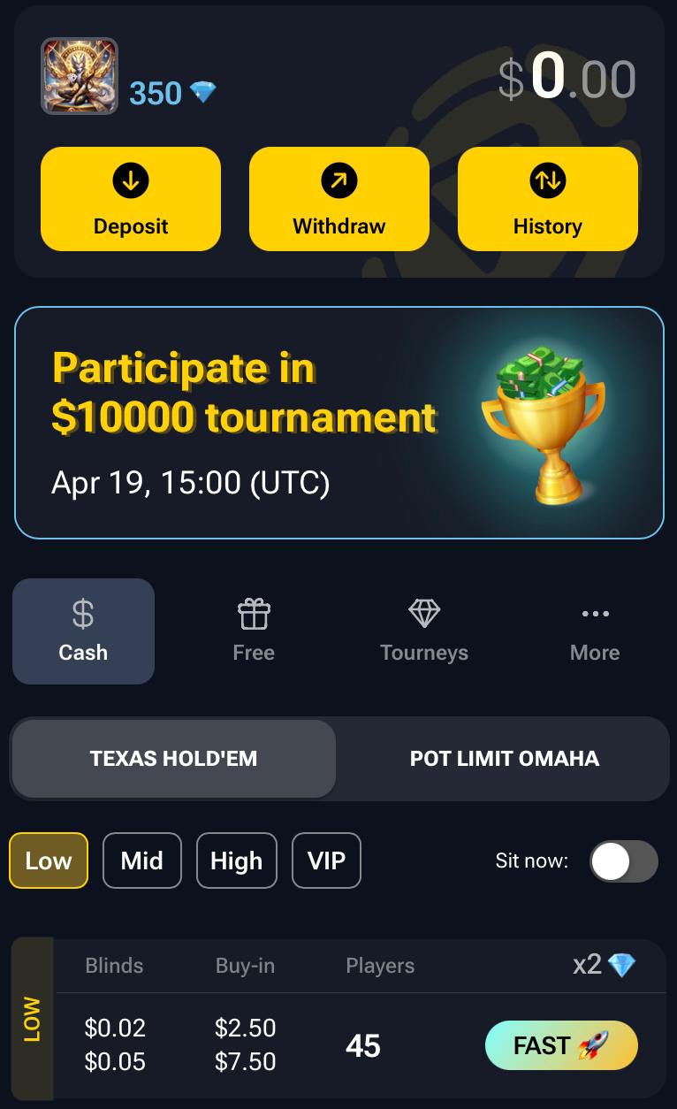 - Low — на $200 для участников $1.50 и $3.50 Sit&Go и $3 Windfall