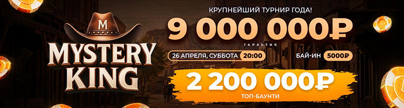 Главным событием станет ₽5К Mystery King ₽9К GTD с топ мистери-баунти = ₽2,2М. Турнир пройдёт 26 апреля.