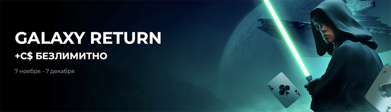 Играйте за кеш-столами и получайте по C$2.5 за каждые $10 рейка. До начала акции нужно активировать «Galaxy Return» в разделе Промо. Ограничений по количеству наигранных бонусов нет.