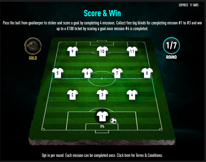 До 11 июля на RedStar Poker продолжается акция Score&Win. Выбираете команду (это ни на что не влияет) и жмёте «Opt-In». А дальше выполняете 7 раундов по 4 миссии и зарабатывайте случайную награду вплоть до билета на €100 Main Sunday Sweat. Миссии простые (получите баунти в турнире Bounty Hunters, выиграйте 2 твистера подряд и т.д.), один игрок даже завершил их все на следующий день после начала акции, так что время ещё есть.